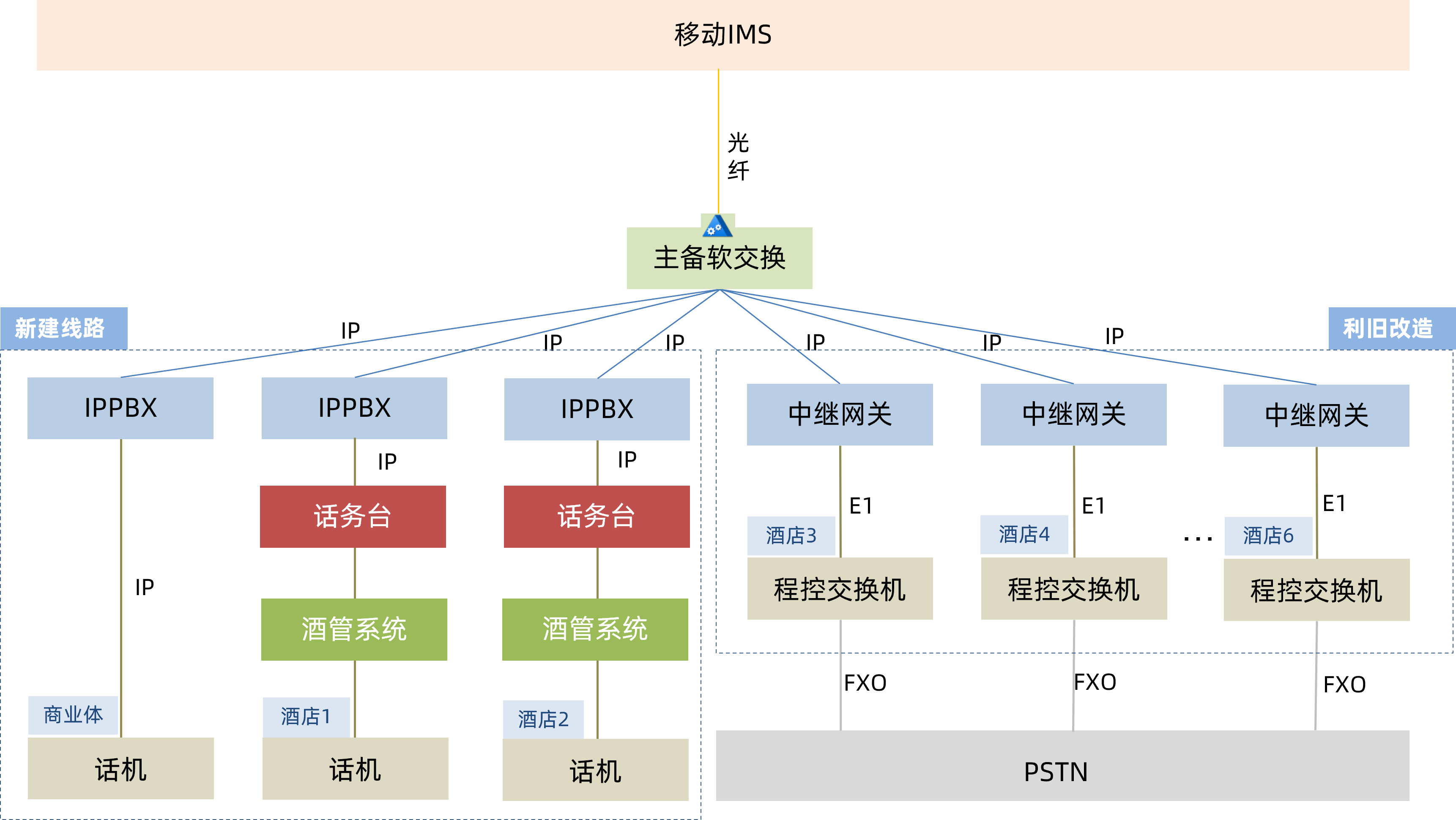 2)原有程控交換機通過網(wǎng)經(jīng)科技中繼網(wǎng)關(guān),實現(xiàn)E1信令和VoIP協(xié)議的轉(zhuǎn)化,由軟交換統(tǒng)一匯聚話務(wù)送至核心網(wǎng),酒店側(cè)保留模擬中繼線接入PSTN作為應(yīng)急通信手段。