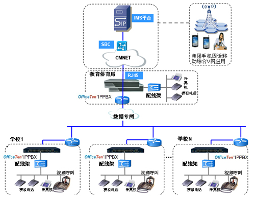 本次項目采用網(wǎng)經(jīng)科技OfficeTen系列IP PBX設備,具備功能豐富、組網(wǎng)靈活、接口開放等特點,能快速方便的把分布在全區(qū)域的所有學校和教育體育局連成一個整體,提升溝通效率。本次語音專網(wǎng)系統(tǒng)分為二級結構,教育體育局為一級核心交換局點,各學校為二級接入局點。下屬所有學校通過光纖專線和教體局核心點互聯(lián),組成語音專網(wǎng),教育體育局集中連到河南移動的語音網(wǎng)絡,實現(xiàn)電話專網(wǎng)統(tǒng)一出口。